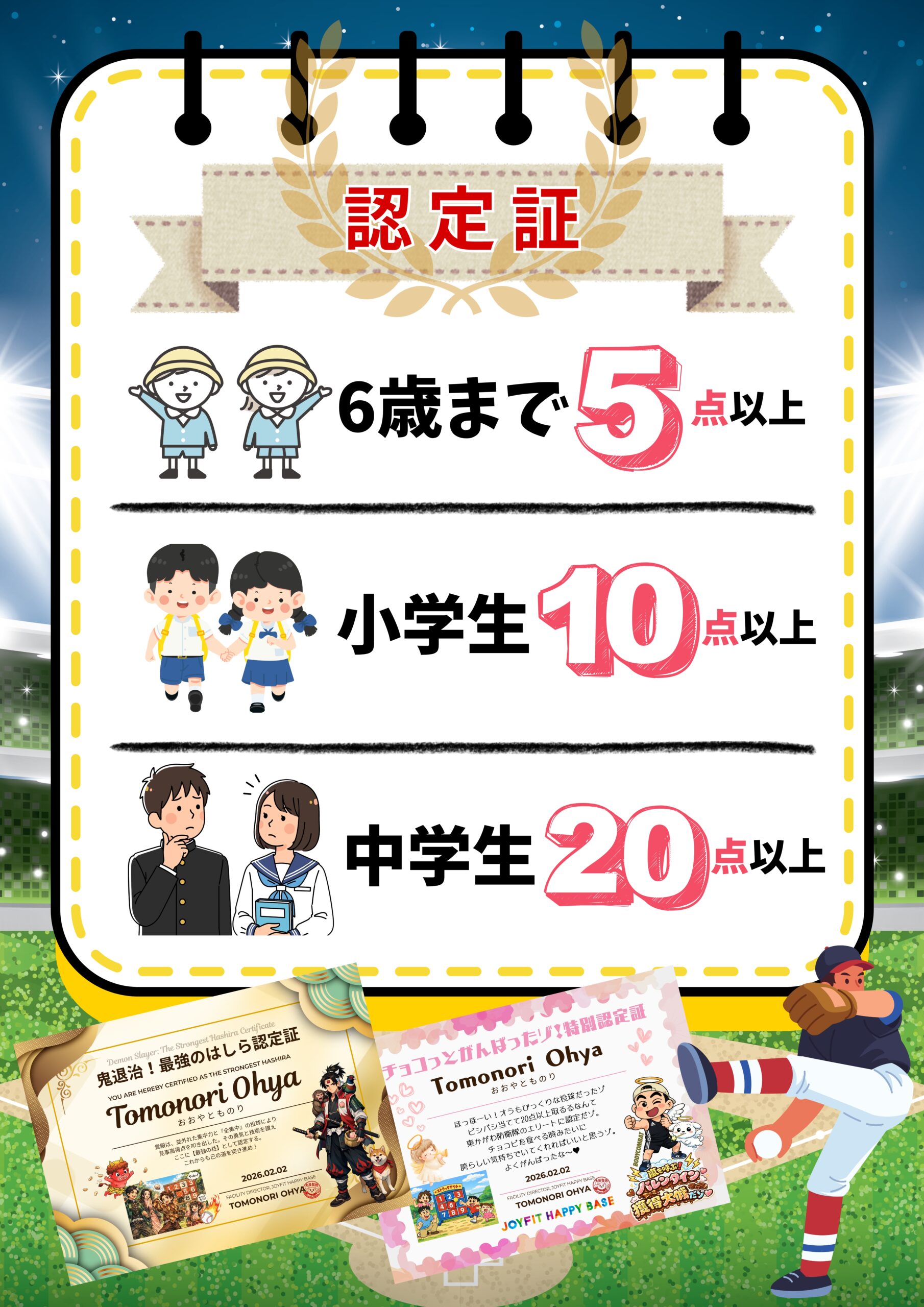 🥎20点以上:景品3個 + 特別認定証GET!!